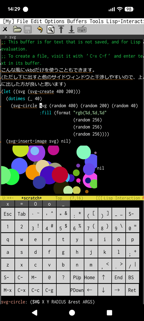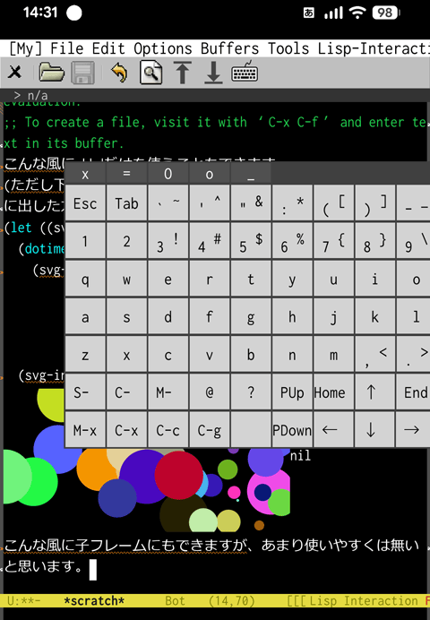 通常の仮想キーボードを無効化すると、完全にこの仮想キーボードだけでEmacsを操作することも可能です。