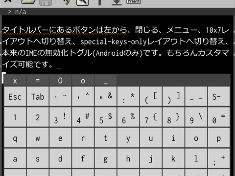 仮想キーボードのタイトルバーにあるボタンは左から「閉じる」「メニュー」「10x7配列へ切替」「特殊キーのみ配列へ切替」「ネイティブ仮想キーボード無効化トグル(Android時のみ)」です。もちろんこれらタイトルバーの構成は自由にカスタマイズ可能です(M-x customize-group vkbd-title-bar)。